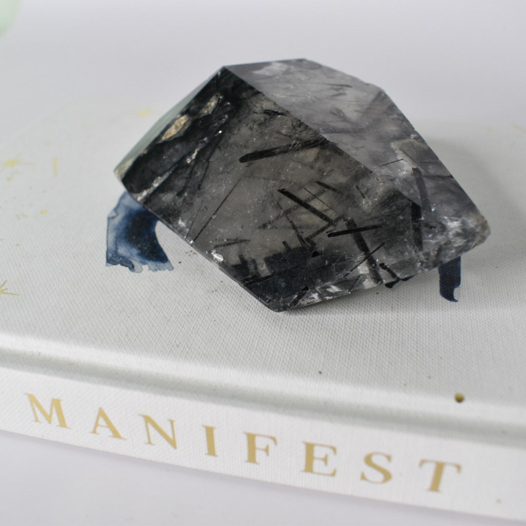 With strands of Tourmaline infused in Quartz, this crystal does double duty: it opens and activates your root chakra, pulling you into deep connection with Mother Earth while helping you feel solid and centered in your own skin.