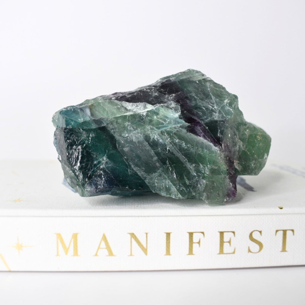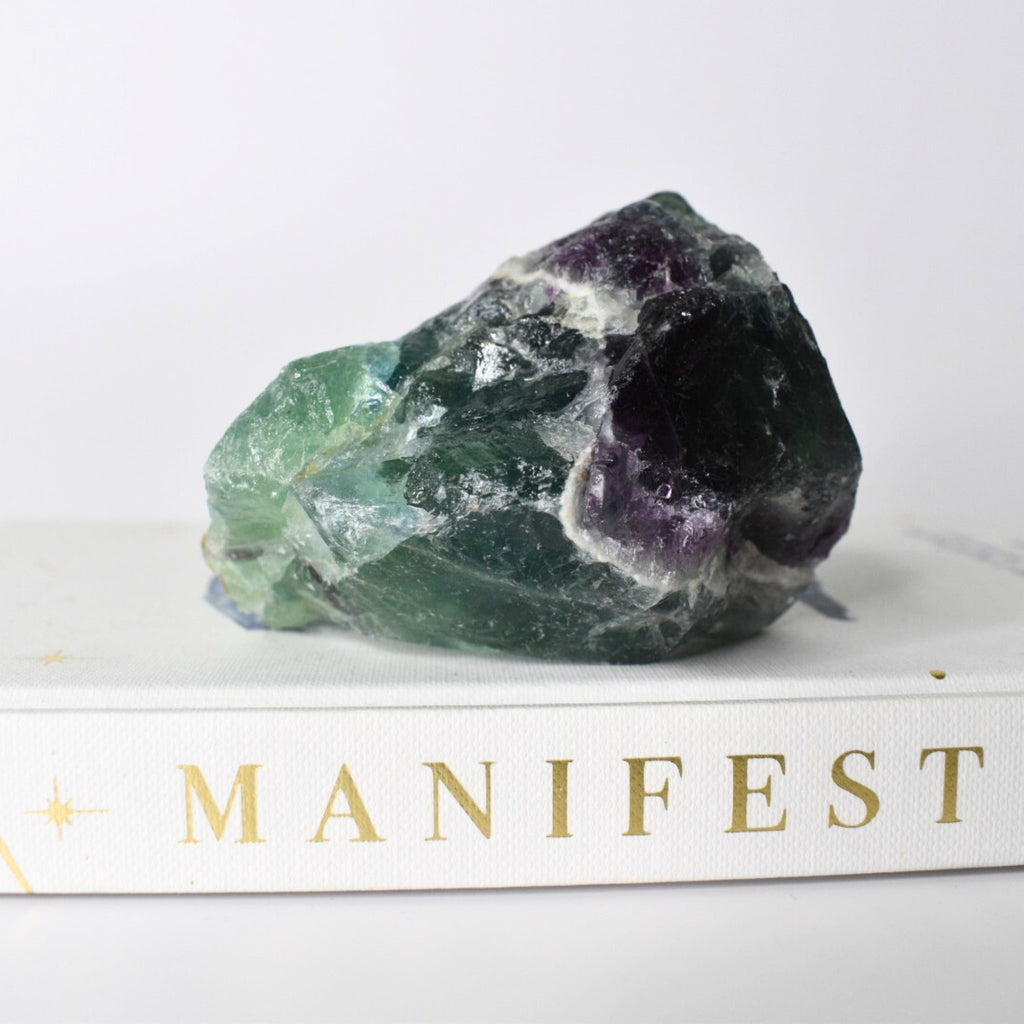 The origin of the word “fluorite” comes from the Latin word flux, which means to flow interchangeably. This word both refers to the way in which fluorites colors seem to shift and blend in the light, as well as the way it unblocks stagnant energy and promotes energetic flow.