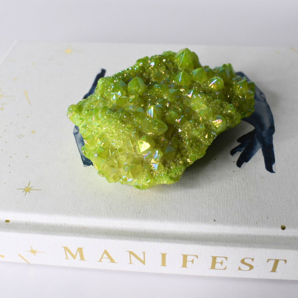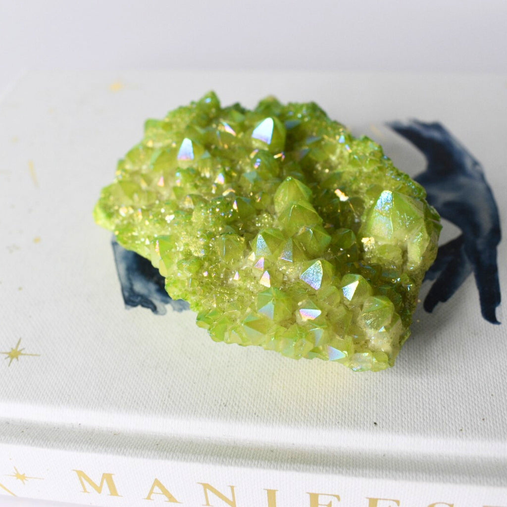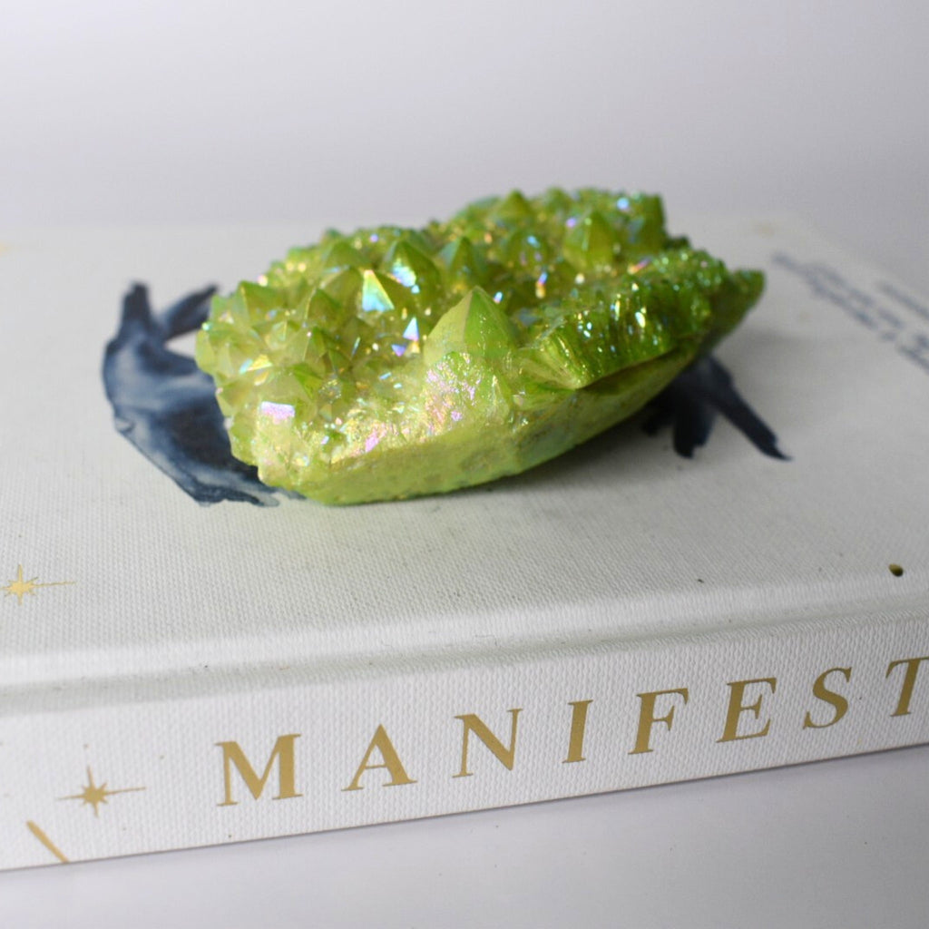 Apple Aura Quartz is a form of clear quartz that's been treated with a thin layer of metal, typically a mix of platinum and gold, to create its bright green, almost otherworldly color and iridescence. This process is called "vapor deposition" and bonds the metals to the quartz at a molecular level, resulting in a dazzling, luminous finish that can display a rainbow sheen when exposed to light.