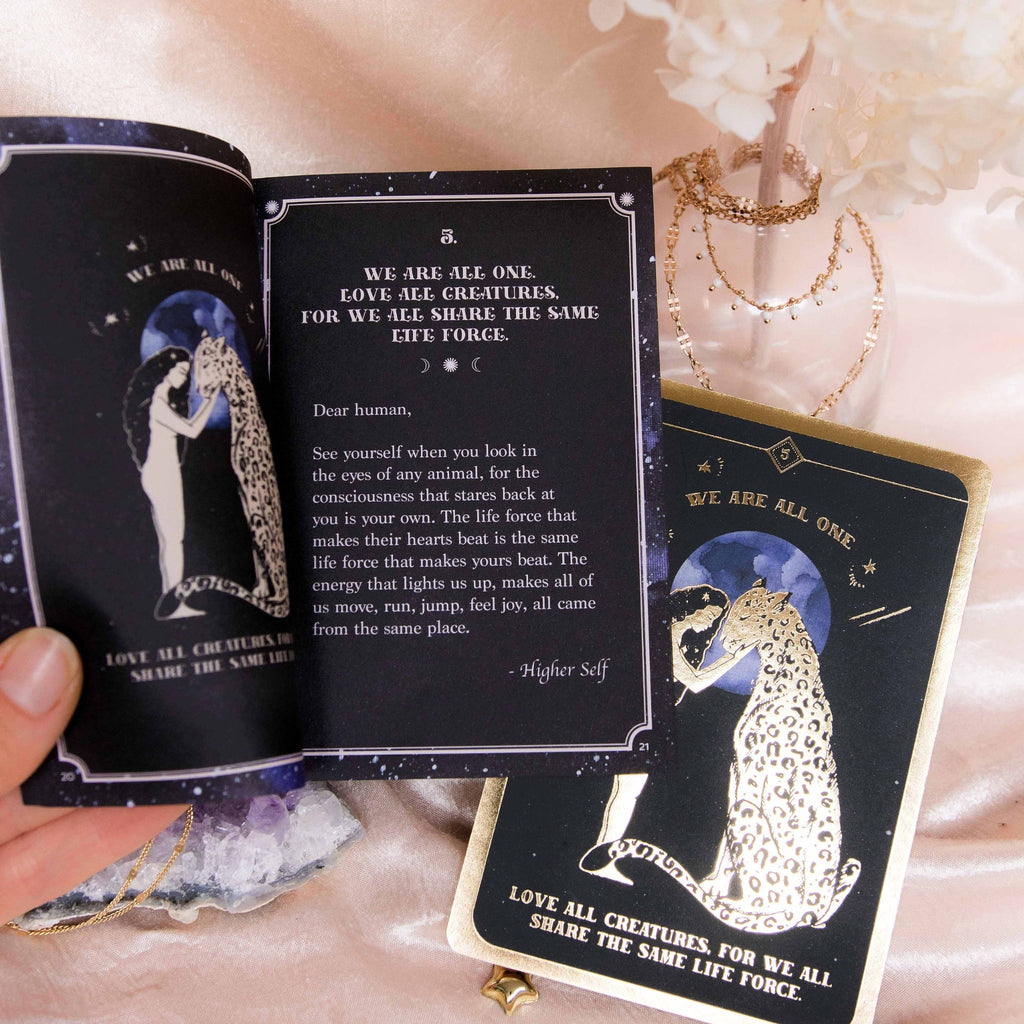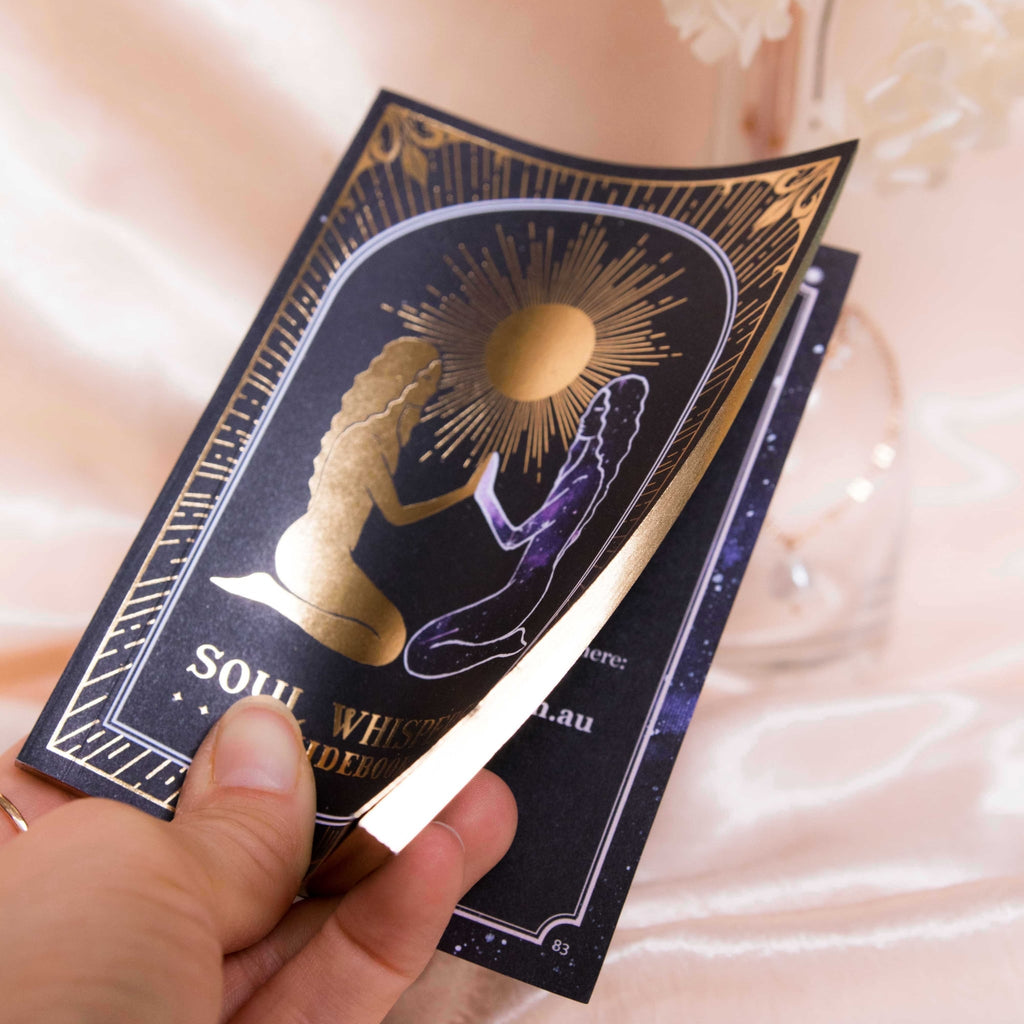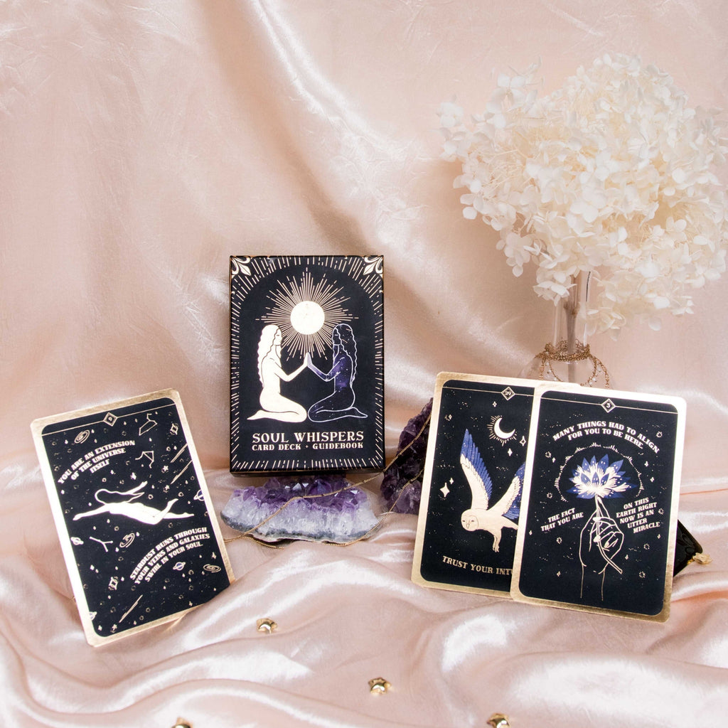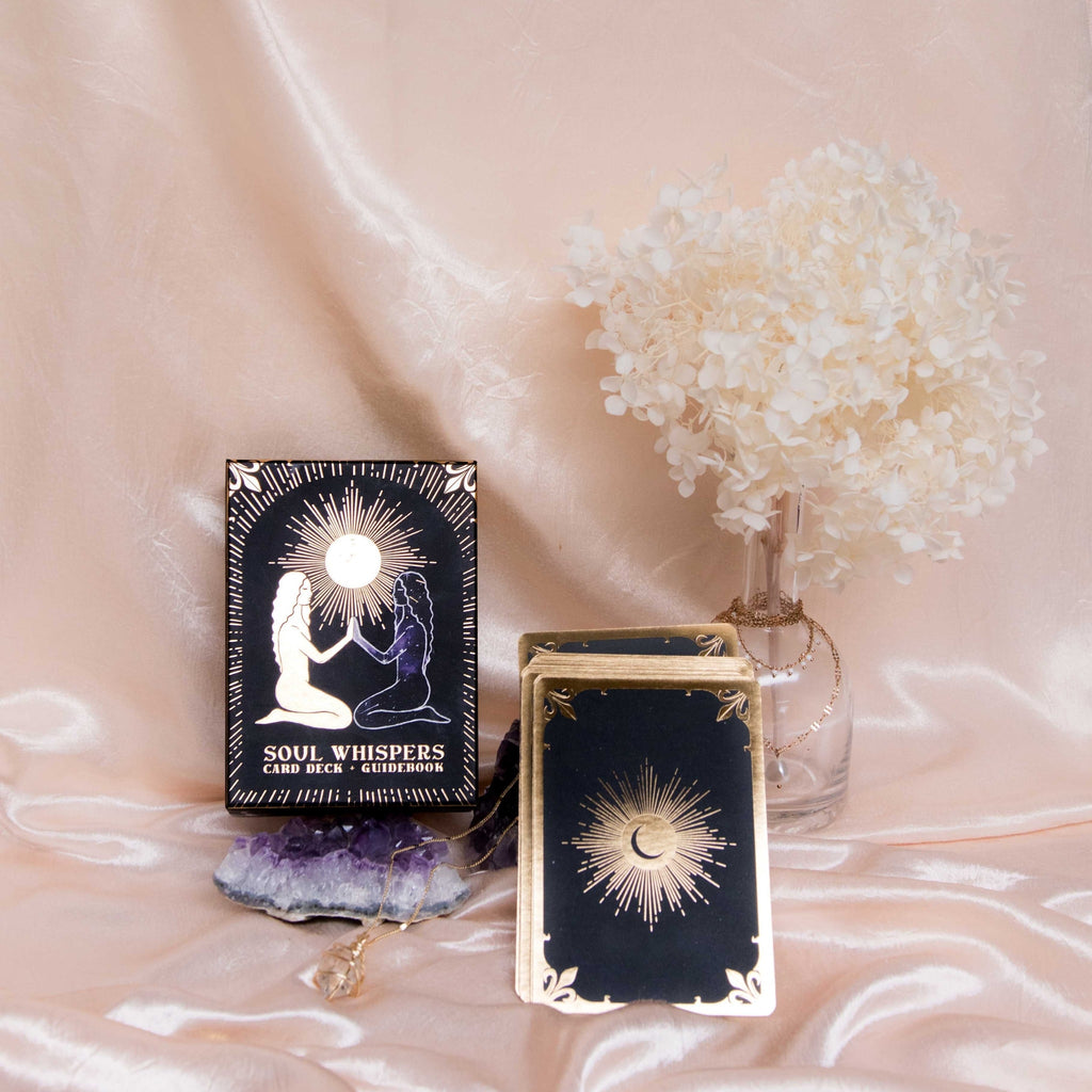 Soul Whispers is a 33 card deck with simple messages from our Higher Selves that help us expand our consciousness and rise into the powerful, loving, free version of ourselves. Gentle reminders of love, compassion, gratitude, and magic, to help us grow our self awareness and look within.